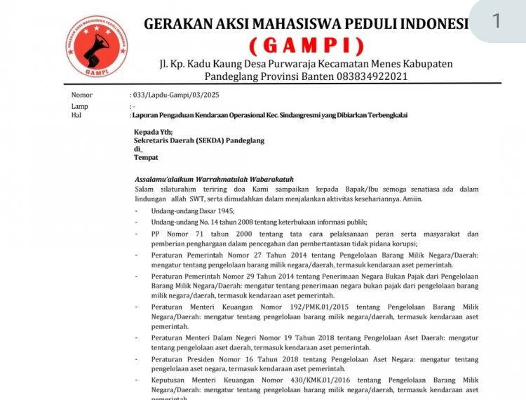redaksi-one.com, Pandeglang, Banten | Gerakan Mahasiswa Peduli Indonesia (GAMPI) laporkan Camat Sindangresmi Ke Sekda Pandeglang, Terkait Kendaraan dinas milik pemerintahan Kecamatan Sindangresmi Kabupaten Pandeglang dibiarkan terbengkalai didepan Kantor Desa Bojongmanik, sudah beberapa bulan kebelakang.