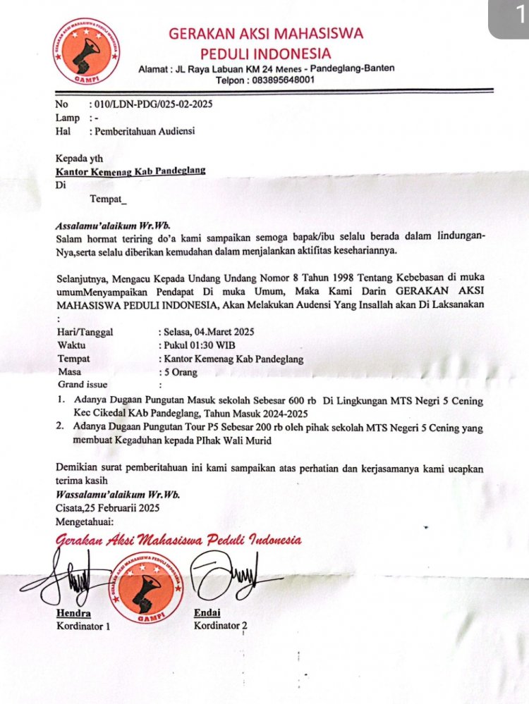 Aktivis GAMPI Layangkan Surat Audiensi Terkait Dugaan Pungli Uang Masuk & Kegiatan P5 Di MTsN 5 Pandeglang
