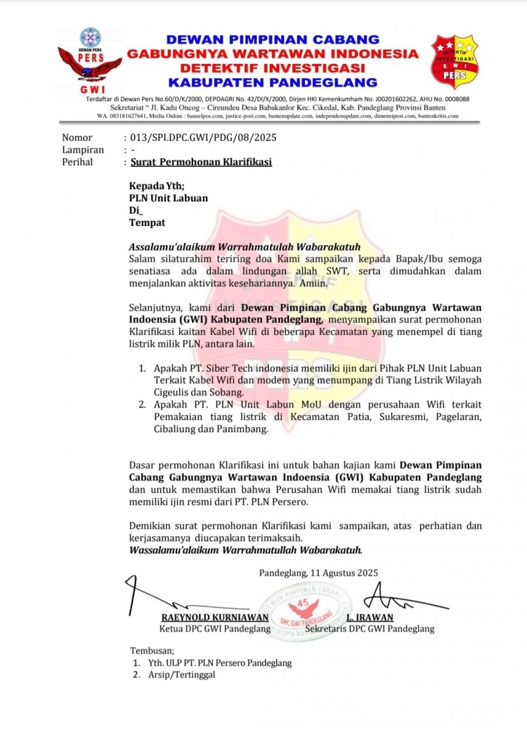L. Irawan, Sekretaris DPC GWI Kab. Pandeglang menyampaikan kepada awak media "Kami Sudah layangkan surat konfirmasi Ke PLN Unit Labuan terkait kabel dan Modem Wifi yang menempel di Tiang listrik milik PLN, Apakah ada atau tidak ada izin ke PLN dan hampir semua jaringan wifi di kabupaten Pandeglang nempel di tiang listrik PLN pak" ujarnya.